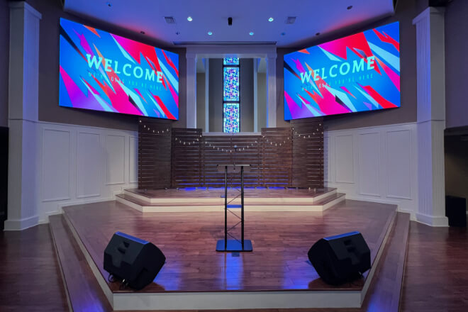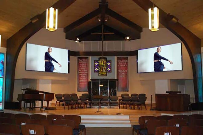 For smaller churches, a small LED video wall may be sufficient, perhaps displaying content behind the pulpit or on a wall.