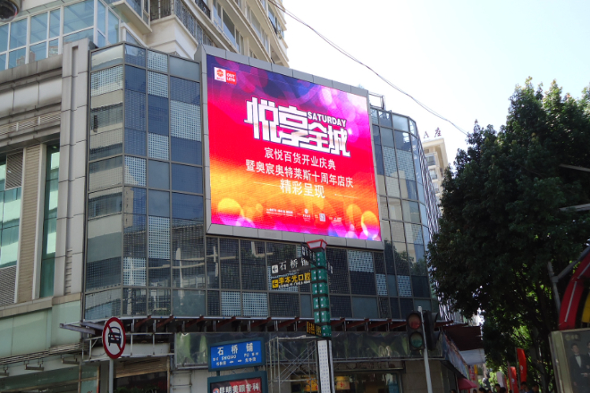 For example, a large screen on the exterior wall of a shopping mall can display brand advertisements at the top, promotional activities in the middle, and scrolling weather or traffic information at the bottom.