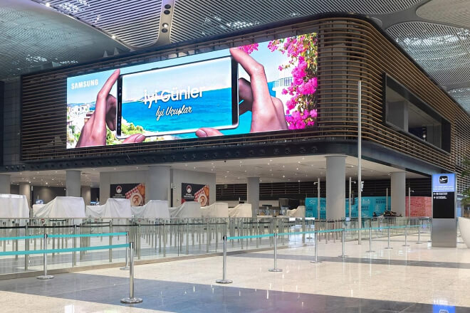 For example, placing LED display advertisements in high-traffic public places such as centres commerciaux, aéroports.