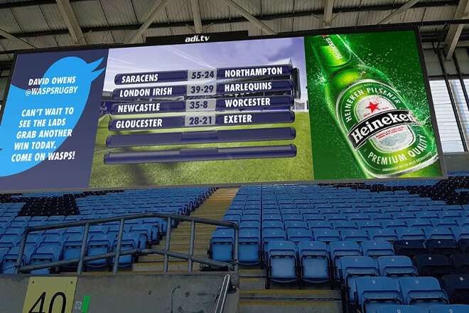Modern sports stadiums typically have multiple LED screens, uniformly controlled through a content management system (CMS).