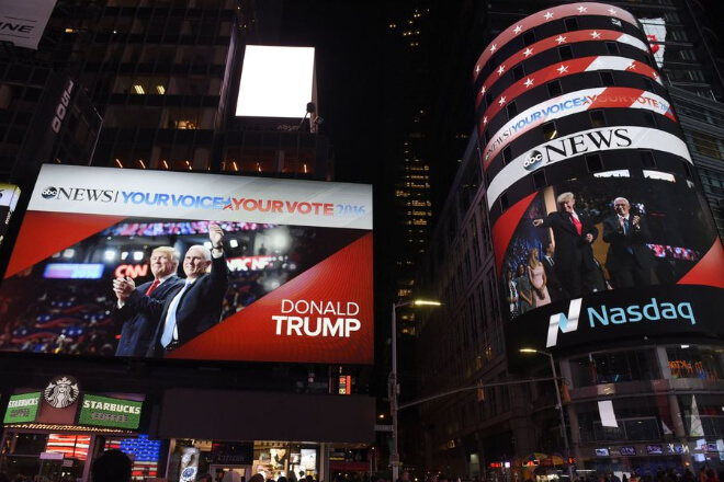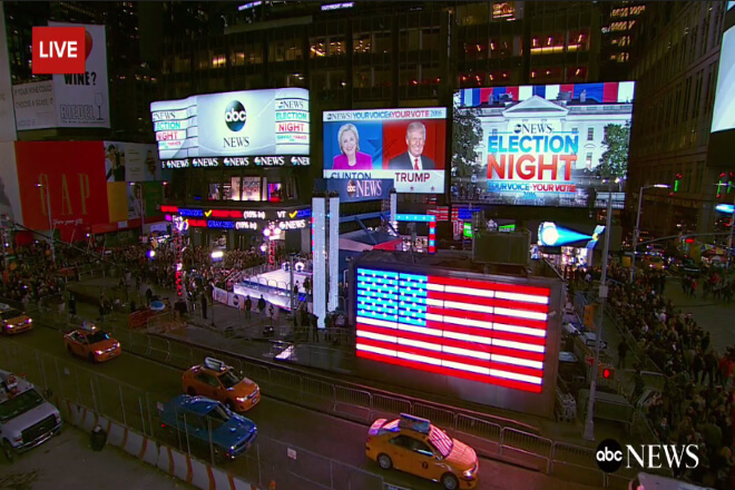 Similarly, during the 2016 US presidential election, LED screens in several subway stations and commercial areas in New York City displayed campaign messages from both Trump and Hillary Clinton.