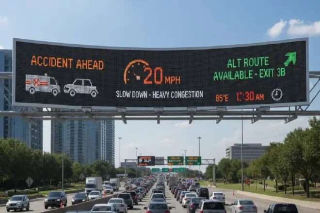 On Los Angeles highways, LED information boards near intersections and ramps refresh data every minute, displaying “Accident Ahead,” “Detour Suggestions,” and “Estimated Travel Time.”
